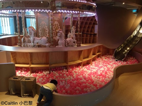 在餐廳中間有一座華麗的旋轉木馬,遊戲區分為二區,一區是採用德國HAPE原木辦家家酒玩具,另一區則是大型動力沙坑,另外還有造型滑步車、繪本閱讀區、0-2寶寶爬爬區與特別的躲貓貓隧道。