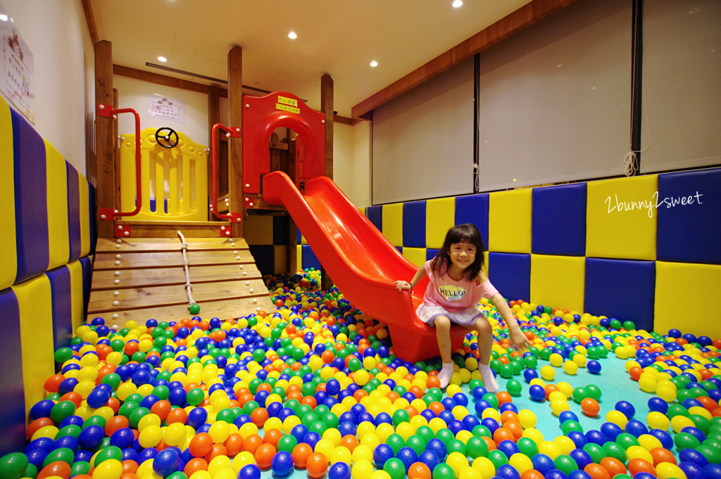 晶采樂園位在飯店一樓,有溜滑梯球池與數十種玩具、拼圖、益智遊戲,還有繪本圖書...等,若入住有浴缸的房型,小朋友還能開心泡水。