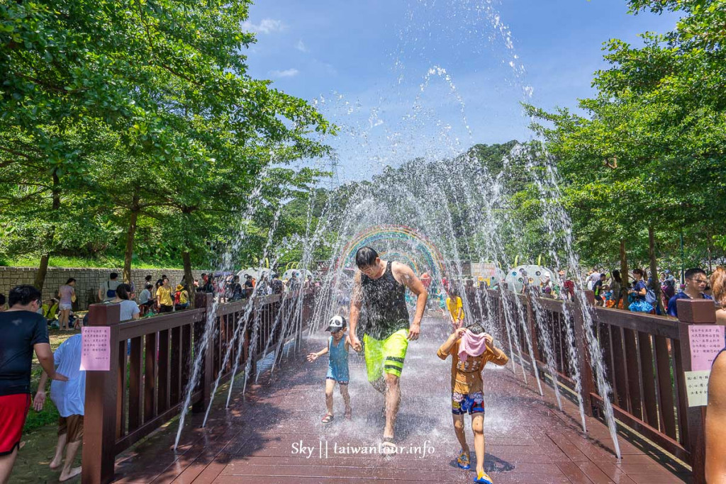 2017年公園內新增幼兒戲水池,彩虹拱門好吸睛,圓形戲水池上有四座大象造型溜滑梯,另外也新增了流動廁所、更衣間、沖洗區,更方便了。噴水設施開放時間09:30-11:00、16:00-17:30(週一、五清潔休園)。