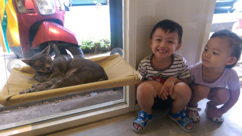 餐廳簡潔寬敞,壁面裝飾著可愛貓咪圖樣,還有漂亮的貓照片。這裡的貓咪都是主人收養的流浪貓,貓咪們自在的在店內行走,喜愛動物的小朋友們最愛尋找牠們的蹤影。