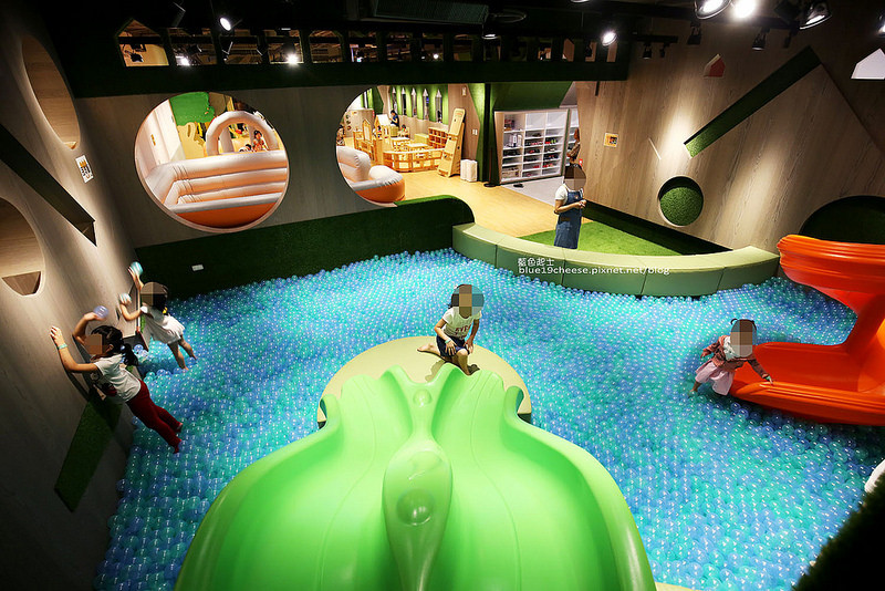 餐廳設有0-2歲與75-140公分二區遊戲空間,採用德國進口HABA木製質感遊具,有耗盡小朋友體力的氣墊跳跳床、廚房組、買菜區、攀爬區、決明子沙坑、滑步車、益智玩具等,小朋友最愛的溜滑梯球池,有旋轉與瀑布二種滑道,藍綠色半透明球池帶點海洋風,球池旁的丟球牆還可以順練小朋友手眼協調。