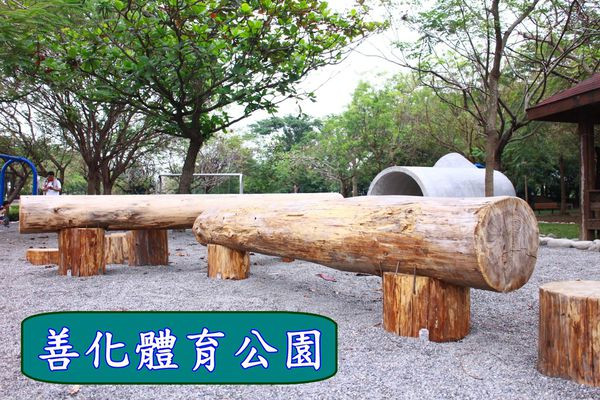 位在台南的善化體育公園增設「親子成長體驗區」,於2016年11月正式開放啟用,公園的設計不再使用傳統的塑製溜滑梯,原木組成的休閒座椅,也是小小孩的攀爬平衡木,一旁擺放數個水泥涵管,小朋友可以鑽進爬出,在裡面大玩回音遊戲。