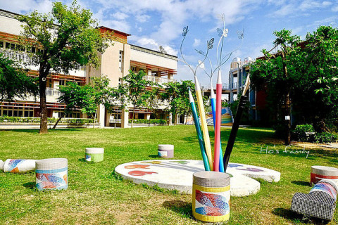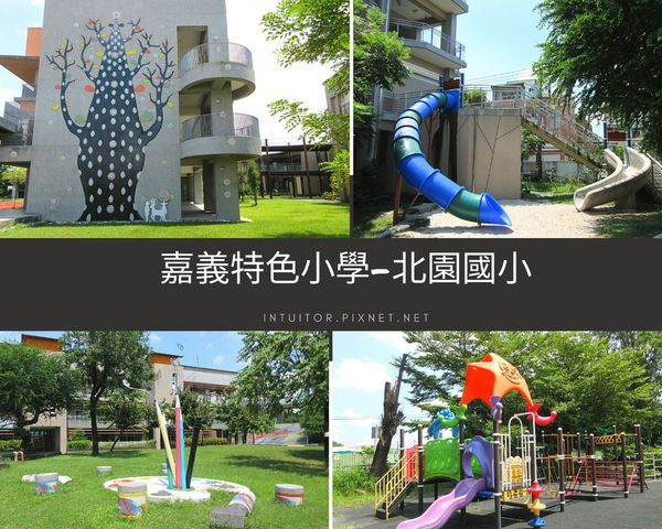 位在嘉義市的北園國小,創校近100年,這幾年校園進行整修,融入創新元素更有活力,彩色的馬賽克磁磚外牆代表著北園國小的熱情,寬敞的草皮上有著幾支大大的色鉛筆,像徵著小朋友們繽紛美好的童年。
