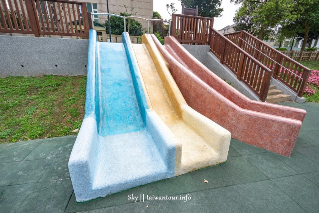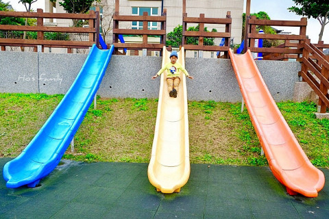 公園裡有一座溜滑梯攀爬組,大小滑道適合各年齡層,一旁有個特別的搖搖椅,四個座椅的設計可以讓手足一起玩。彩色滑道很搶眼,滑下去有一定的速度,較適合大一點的小朋友,前方長頸鹿造型攀爬可愛又好玩。