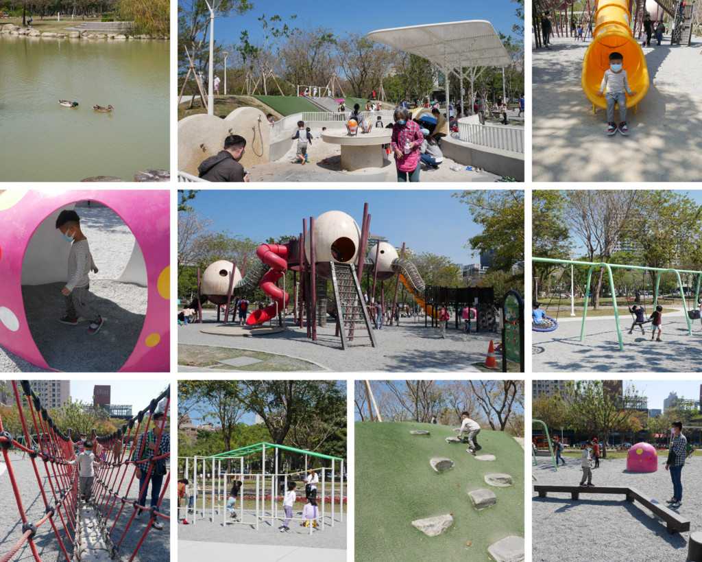公園有景觀步道、自行車道、生態池、大片草地,帶小朋友來可以跑跳、餵魚、看鴨鵝、野餐。